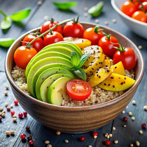 Rasakan kesegaran alpukat yang berpadu dengan quinoa, tomat cherry, dan daun selada dalam satu hidangan yang menyehatkan.